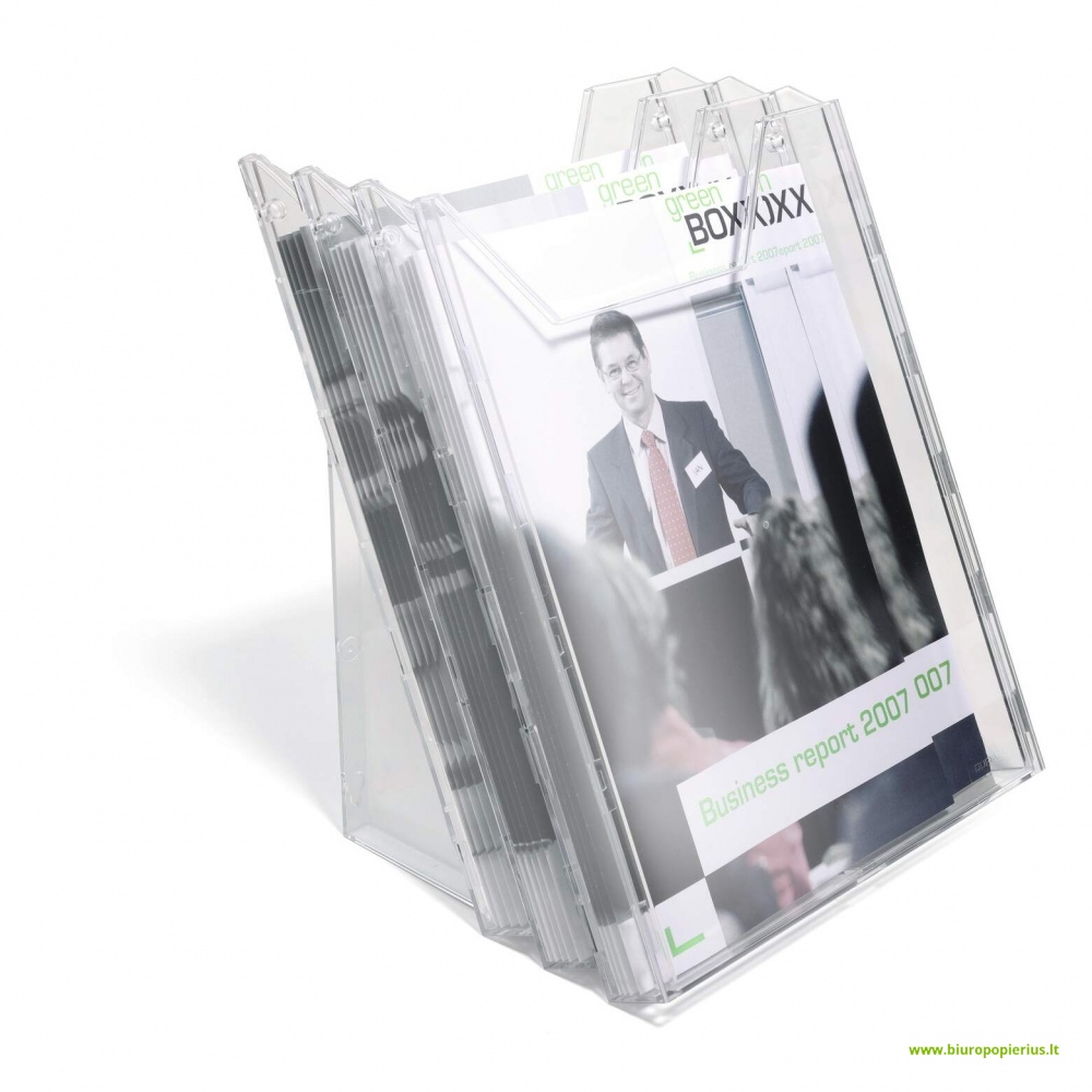 Skirtas informaciniams lankstukams sudėti. Stovas yra pastatomas ant stalo arba kabinamas and sienos. Susideda iš atskirų dalių. Lengvai praplečiama iki norimo lišenėlių skaičiaus jungiant papildomas kišenėles. Lengvai išvalomas. Pagamintas iš skaidraus plastiko. Skaidrus, A4 formato. 3 dalių. Yra skirtos specialios kišenės DO200-02501.