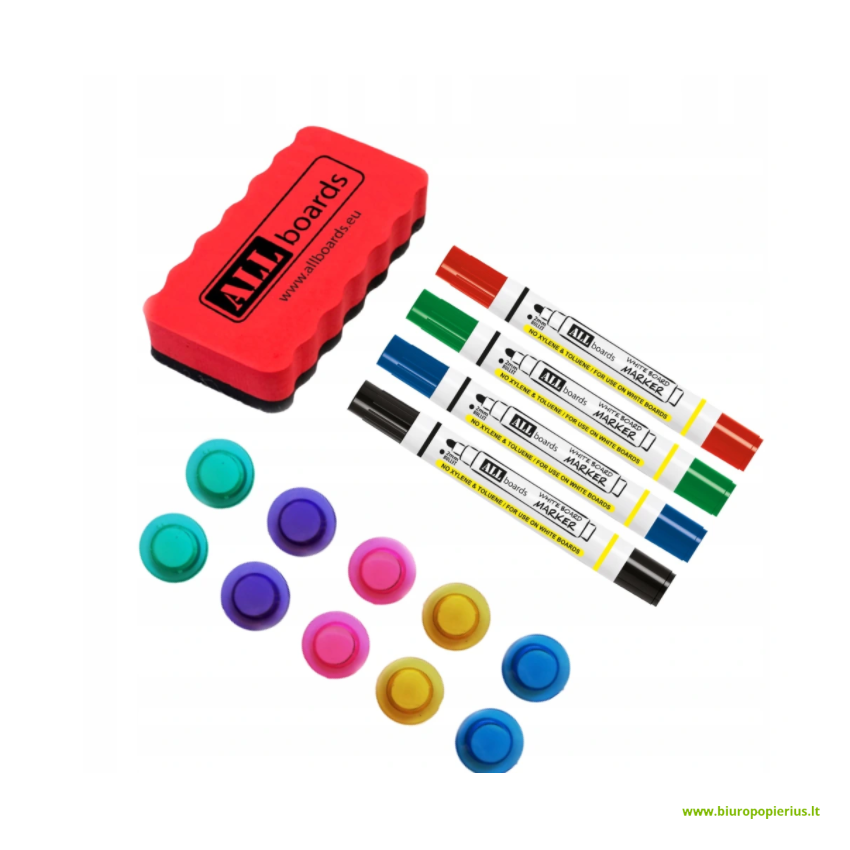 • Komplekte: tvirtinimo rinkinys, lentynėlė, 4 žymekliai, kempinė, 10 spalvotų magnetų.