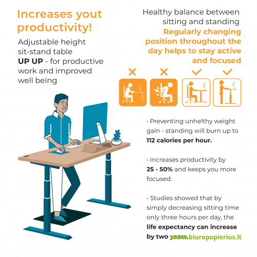 “Up Up” - ergonomiški stalai idealiai tinka jūsų biurui. Reguliuojamas stalo aukštis leidžia lengvai ir paprastai keisti stalo aukštį, todėl galima dirbti tiek sėdint, tiek stovint.